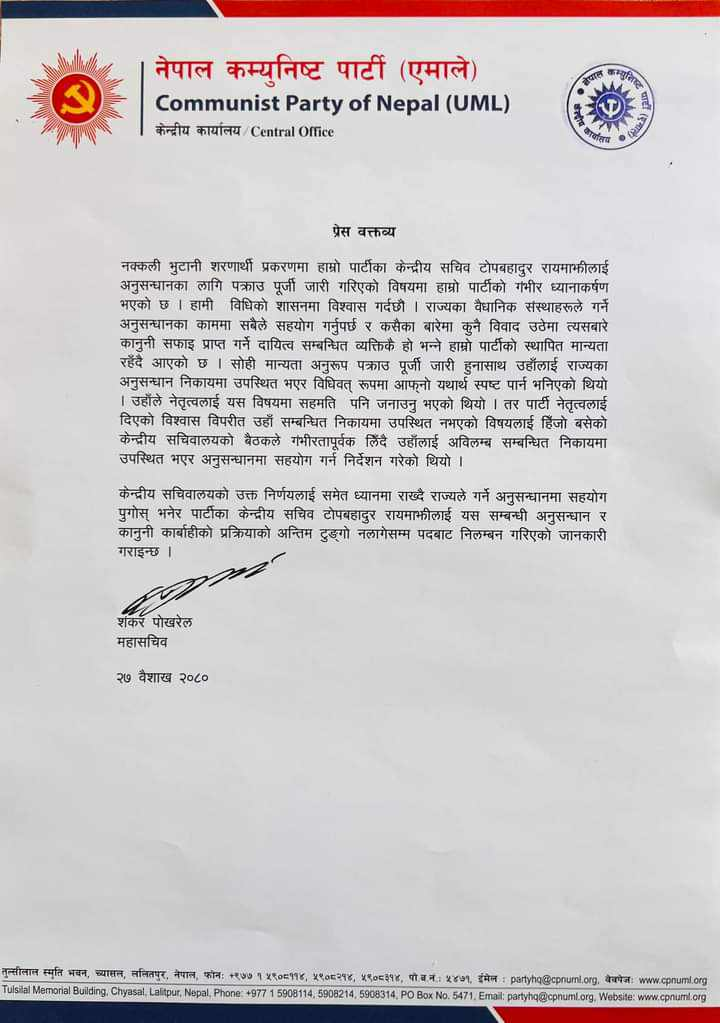 प्रेस वक्तव्य भनिएको छ नक्कली भुटानी शरणार्थी प्रकरणमा हाम्रो पार्टीका केन्द्रीय सचिव टोपबहादुर रायमाझीलाई अनुसन्धानका लागि पक्राउ पूर्जी जारी गरिएको विषयमा हाम्रो पार्टीको गंभीर ध्यानाकर्षण भएको छ । हामी विधिको शासनमा विश्वास गर्दछौ ।