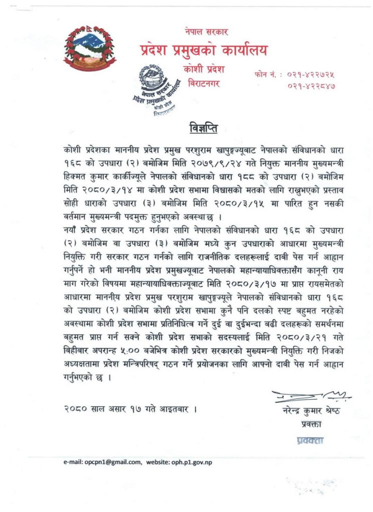 कोशी प्रदेशमा पाँच दिनको समय दिएर नयाँ सरकार गठनको आह्वान