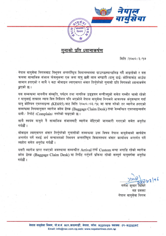 उक्त भाइरल पोष्टमा पर्यटनमन्त्री सुदन किरातीले चासो देखाएपछि आइतबार निगमले विप्ति जारी गर्दै यात्रुले एयरलाइन्ससँग रिपोर्ट नै नगरेको बताएको हो । दक्षिण कोरियाबाट आउँदा आफ्नो सामान हराएको दाबी गर्दै दामु दाइ भन्ने छविलाल भण्डारीले सामाजिक सञ्जालमा गुनासो गरेका थिए ।