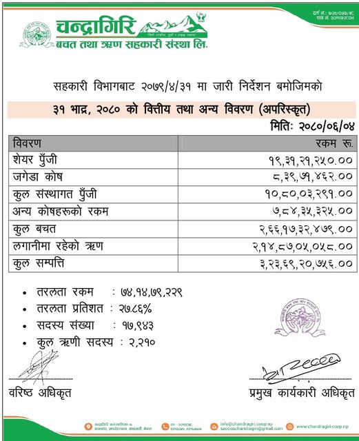 चन्द्रागिरि साकोसमा २७.८६ प्रतिशत तरलता