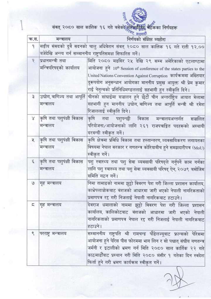 ’’ यसैगरी, कृषि तथा पशुपन्छी विकास मन्त्रालयअन्तर्गत सञ्चालित परियोजना–आयोजनाका लागि २६१ राजपत्राङ्कित पदहरुको अस्थायी दरबन्दी स्वीकृत गर्ने निर्णय पनि बैठकले गरेको छ ।