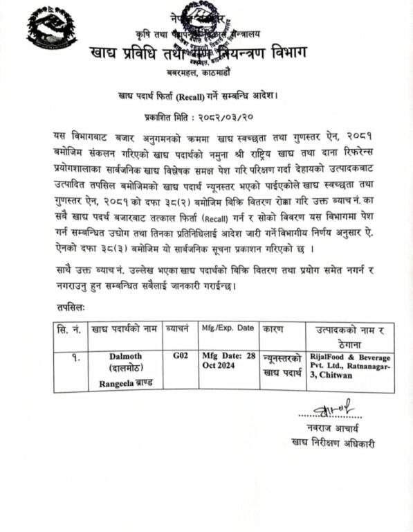 गुणस्तरहिन हटपट चाउचाउ र रंगीला दालमोठ बजारबाट फिर्ता लिन सरकारको निर्देशन