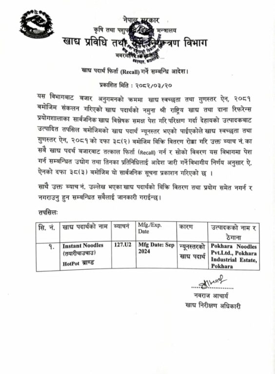 काठमाडौं । गुणस्तरहिन उत्पादन भएको अभियोगमा खाद्य प्रविधि तथा गुण नियन्त्रण विभागले दुई उद्योगको उत्पादन बजारबाट फिर्ता लिन निर्देशन दिएको छ । विभागले शुक्रबार चितवनको रिजाल फूड तथा वेभेरेज प्राइभेट लिमिटेड र पोखरास्थित पोखरा नुडल्स प्राइभेट लिमिटेडलाई पत्र पठाउँदै गुणस्तरहिन उत्पादन बजारबाट फिर्ता लिन निर्देशन दिएको हो । विभागले ति दुवै उत्पादनको बिक्री बितरणमा प्रतिवन्धसमेत लगाएको छ । विभागको केन्द्रिय राष्ट्रिय खाद्य तथा दाना रिफरेन्स प्रयोगशालामा ति दुवै उत्पादनको परीक्षण पश्चात बिक्री बितरण रोक्का गर्नुका साथै बजारबाट उत्पादन फिर्ता लैजान सम्बन्धित उद्योगलाई निर्देशन दिइएको हो । पोखरा नुडल्स प्राइभेट लिमिटेडले उत्पादन गरेको हटपट ब्राण्डको इन्स्टान्ट नुडल्सको ब्याच नम्बर १२७.यु २ र उत्पादन मिति २०२४ सेप्टेम्बर भएको चाउचाउ बजारबाट फिर्ता लैजान उक्त उद्योगलाई निर्देशन दिएको छ । तोकिएको मापदण्डविपरित न्यूनस्तरको उत्पादन भएको अभियोगमा बिभागले उक्त उत्पादन बजारबाट फिर्ता लैजान निर्देशन दिएको हो । यस्तै चितवनस्थित रिजाल फूड एण्ड वेभरेजले उत्पादन गरेको रंगीला ब्राण्डको दालमोठ पनि न्यून गुणस्तर भएको भन्दै बजारबाट फिर्ता लैजान निर्देशन दिएको हो । ब्याच नम्बर जी ०२ र उत्पादन मिति २०२४ अक्टुवर २८ रहेको उक्त दालमोठ फिर्ता लान निर्देशन दिइएको हो ।