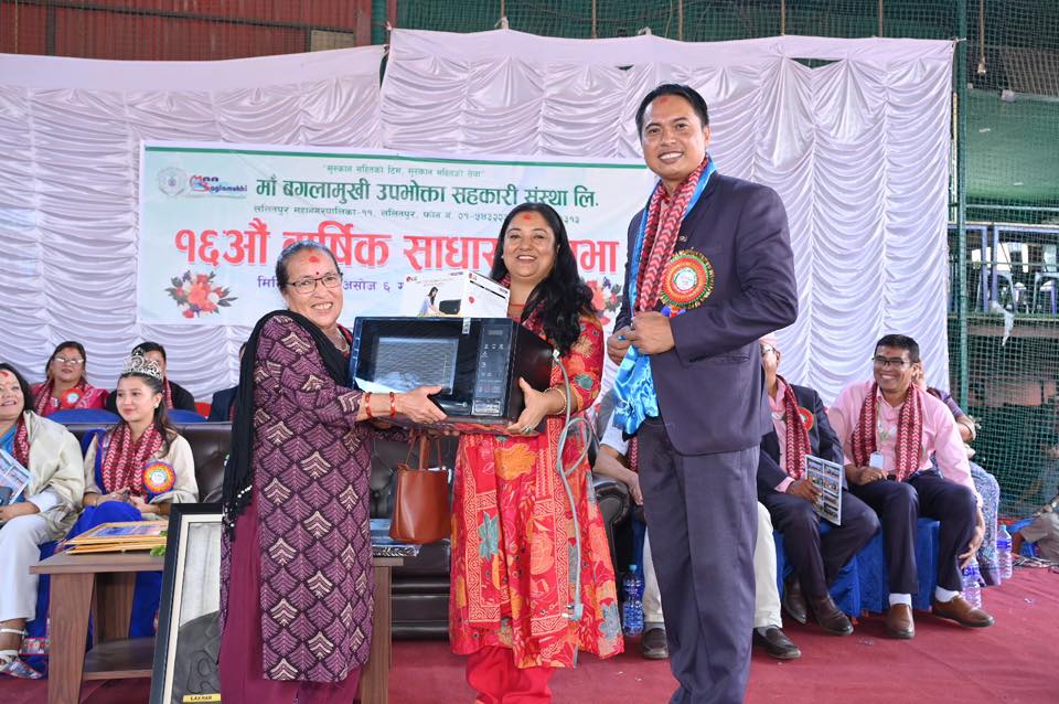 ललितपुर । माँ बगलामुखी उपभोक्ता सहकारी संस्था लि. को १६औँ वार्षिक साधारण सभा दथुलंस्थित माँ बंगलामुखी फुटसलमा सम्पन्न भएको छ । कार्यक्रम संस्थाका अध्यक्ष अधिवक्ता लक्ष्मण महर्जनको सभापतित्वमा सम्पन्न भएको थियो । कार्यक्रममा ज्यापु समाज यल, ललितपुरकी कार्यवाहक अध्यक्ष सबिना महर्जन प्रमुख अतिथि रहनुभएको थियो भने मिस नेवा ११४५ प्रलिशा शाक्य विशेष आतिथ्यका रुपमा उपस्थित हुनु भएको थियो । उक्त साधारण सभाको प्रमुख अतिथि सविना महर्जनले परम्परागत विधिअनुसार दीप प्रज्वलन गरि उद्घाटन गर्नुभयो । त्यस अवसरमा शुभकामना मन्तव्य व्यक्त गर्दै माँ बगलामुखी सहकारीले समाजप्रति उत्तरदायि भएर समाज लक्षित विभिन्न कार्यक्रमहरु संचालन गरेको कार्यले आफु निकै नै प्रभावित रहेको बताउनु भयो । साथै सहकारीले अझ बढी प्रभावकारी रुपमा अघि बढोस र संस्थाको उत्तोेरत्तर प्रगतिको कामना सहित शुभकामना व्यक्त गर्नु भयो । बाग्मती प्रस्कुनका सञ्चालक सदस्य तथा कुम्भेश्वर महिला साकोसकी अध्यक्ष शान्तलक्ष्मी खड्गीले हालको चुनौतीपूर्ण परिस्थितिमा समेत सहकारीको वित्तीय कारोबार वृद्धि भएकोमा खुशी व्यक्त गर्नुभयो । उहाँले सहकारीमा आवद्ध सदस्यहरूले यस संस्थामा कारोबार गर्न पाउँदा गर्व महसुस गर्ने वातावरण बनेको बताउँदै सहकारीको थप प्रगतिको शुभकामना दिनुभयो।