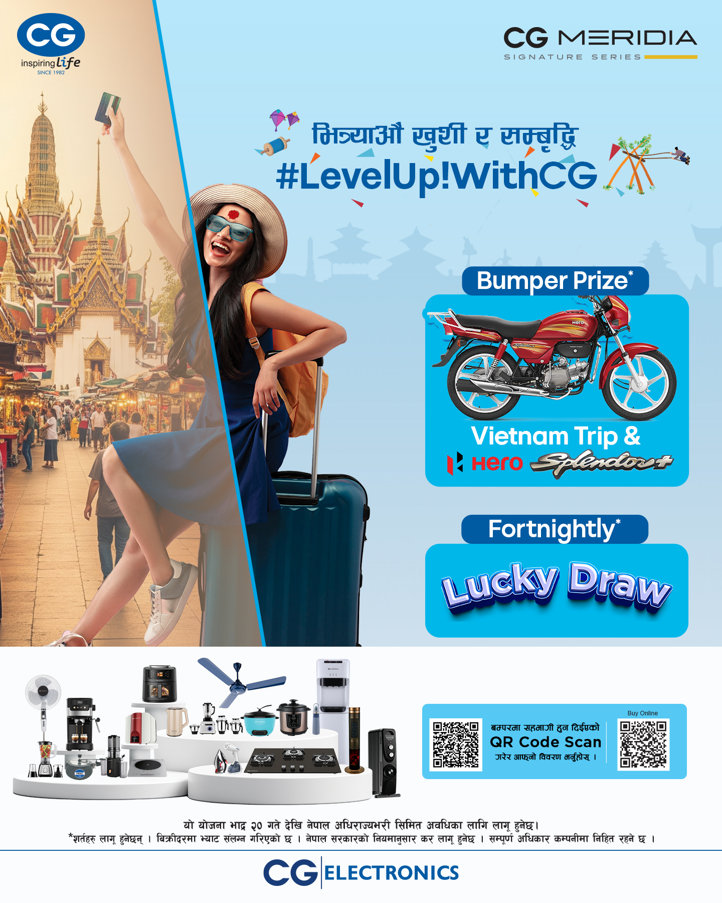 काठमाडौं । नेपालकै अग्रणी र भरोसायोग्य ब्राण्ड सीजीले यस वर्षको चाडपर्वलाई अझ विशेष र उत्साहपूर्ण बनाउन सीजी तथा सीजी मेरिडिया सिग्नेचर सिरिज अन्तर्गत साना घरायसी उपकरणमा विशेष उपभोक्ता योजना सार्वजनिक गरेको छ। यस योजनाले गुणस्तरीय उत्पादन खरिद गर्ने ग्राहकहरूलाई केवल आधुनिक जीवनशैली प्रदान गर्दैन, बरु तिनलाई आकर्षक पुरस्कार जित्ने अवसरसमेत दिन्छ । “भित्र्याऔँ खुशी र समृद्धि #LevelUpWithसीजी”  भन्ने मूल सन्देशसँग यो योजना सुरु गरिएको कम्पनीले जनाएको छ । सीजीले लामो समयदेखि नेपाली उपभोक्ताका लागि विश्वसनीय र प्रगतिशील इलेक्ट्रोनिक्स उत्पादनहरू ल्याउँदै आएको जनाएको छ । चाडपर्वको मौकामा ग्राहकको उत्साह र सन्तुष्टिलाई अझ प्रगाढ बनाउन, यसपटक उपभोक्ताहरूलाई जीवनमा खुशी र समृद्धि भित्र्याउने उद्देश्यले यो अभियान ल्याइएको कम्पनीले जनाएको छ । यस योजनाले ग्राहकलाई गुणस्तर, नवप्रवर्तन र पुरस्कारको समिश्रण प्रदान गरी उनीहरूको जीवनलाई अझ सहज र रोचक बनाउनेछ।