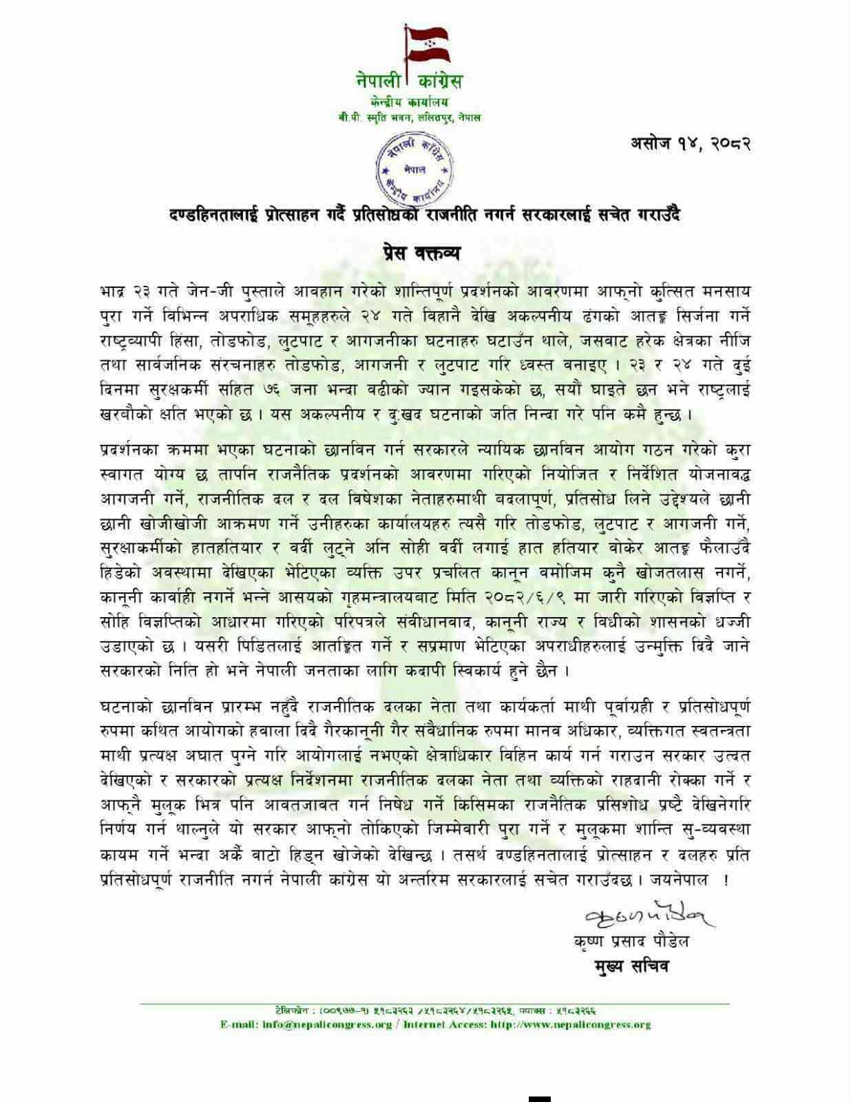काठमाडौँ। नेपाली कांग्रेसले भदौ २३–२४ गते भएको हिंसा, तोडफोड, लुटपाट र आगजनीका घटनामा संलग्नलाई उन्मुक्ति दिएर दण्डहीनतालाई प्रोत्साहन नगर्न सरकारलाई चेतावनी दिएको छ। पार्टीको तर्फबाट मुख्य सचिव कृष्णप्रसाद पौडेलले मंगलबार जारी गरेको वक्तव्यमा ती दुई दिनमा ७६ जनाभन्दा बढीको ज्यान गएको, सयौं घाइते भएको र राष्ट्रलाई खरबौंको क्षति पुगेको उल्लेख गरेको छ। वक्तव्यमा शान्तिपूर्ण प्रदर्शनको आवरणमा नियोजित रुपमा अपराधिक समूहहरूले देशव्यापी आतंक मच्चाएको र राजनीतिक दल तथा नेताहरूमाथि लक्षित आक्रमण गरेको दाबी गरिएको छ। तर गृह मन्त्रालयले असोज ९ गते जारी गरेको विज्ञप्ति र त्यसको आधारमा जारी परिपत्रले प्रमाणित अपराधीहरूलाई कानूनी कारबाही नगरी उन्मुक्ति दिने संकेत गरेको भन्दै कांग्रेसले कडा आपत्ति जनाएको छ। पार्टीले यस्तो कदमले संविधानवाद, कानूनी शासन र विधिको शासनको धज्जी उडाएको आरोप लगाएको छ। कांग्रेसले अन्तरिम सरकारलाई दण्डहीनतालाई प्रोत्साहन गर्ने नीतिबाट पछि हट्न, घटनाको निष्पक्ष छानबिन सुनिश्चित गर्न र प्रतिशोधमूलक राजनीति नगर्न आग्रह गरेको छ। वक्तव्यमा भनिएको छ, घटनाको प्रारम्भिक छानबिन सुरु नहुँदै आयोगको हवाला दिँदै नेताहरूको राहदानी रोक्का गर्ने, मुलुकभित्रको आवतजावत प्रतिबन्धित गर्ने जस्ता कार्यहरू स्पष्ट राजनीतिक प्रतिशोधका उदाहरण हुन्।