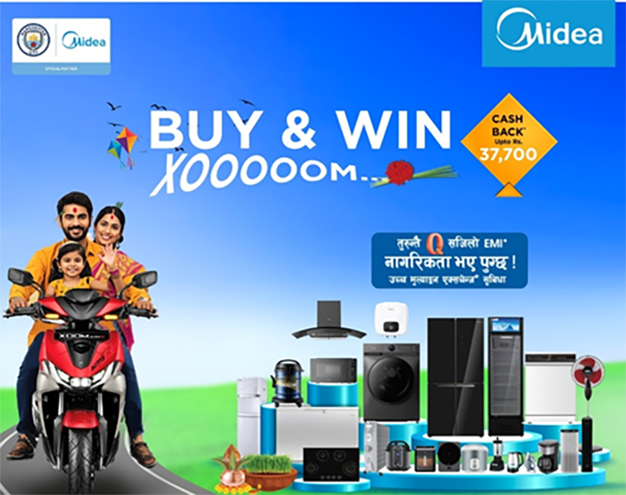 काठमाडौं । सीजी इलेक्ट्रोनिक्सले ग्लोबल होम एप्लायन्स ब्रान्ड माइडियाका तर्फबाट दशैंतिहार लक्षित गरी ‘माइडिया दशैंतिहार २०८२ बाई एन्ड विन जुम’ योजना ल्याएको छ । अफर अन्तर्गत माइडियाका होम एप्लायन्स खरिद गर्ने उपभोक्ताले विभिन्न आकर्षक अफर तथा उपहार पाउनेछन् ।