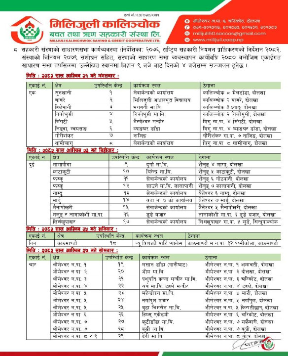दोलखाको चरिकोटमा मुख्य कार्यालय रहेको मिलिजुली कालिञ्चोक बचत तथा ऋण सहकारी संस्थाको साधारणसभा शुरु भएको छ । संस्थाले सदस्यहरुको सहजताका लागि क्षेत्रगत रुपमा सभा गर्ने भएको छ । राष्ट्रिय सहकारी नियमन प्राधिकरणले जारी गरेको साधारणसभा सम्बन्धी निर्देशनको पालना गर्दै असोज २१ गतेदेखि २९ गतेसम्म साधारण सभा गर्न लागेको हो ।