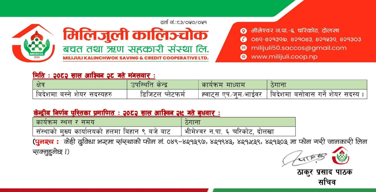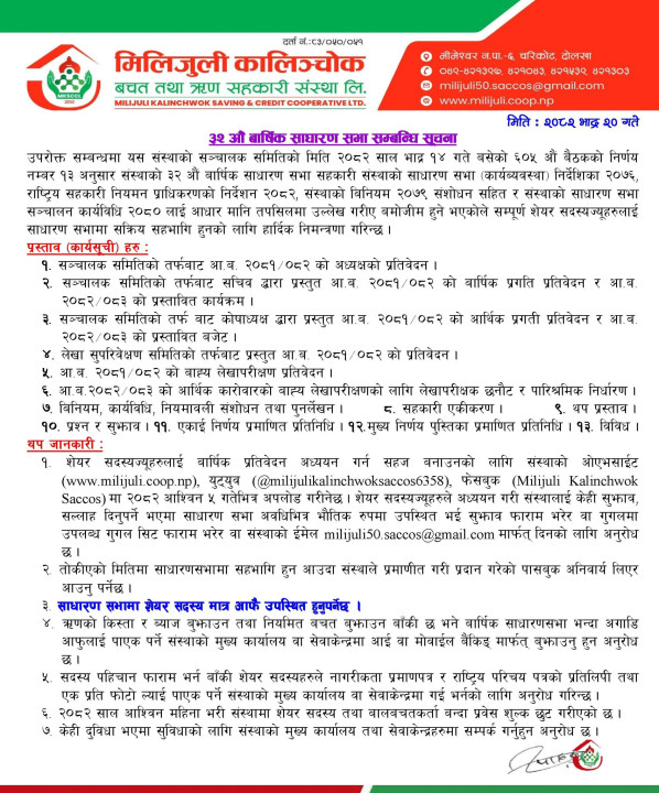 मिलिजुली कालिञ्चोक बचत तथा ऋण सहकारी संस्थाको ३२औं वार्षिक साधारण सभा बस्ने सूचना