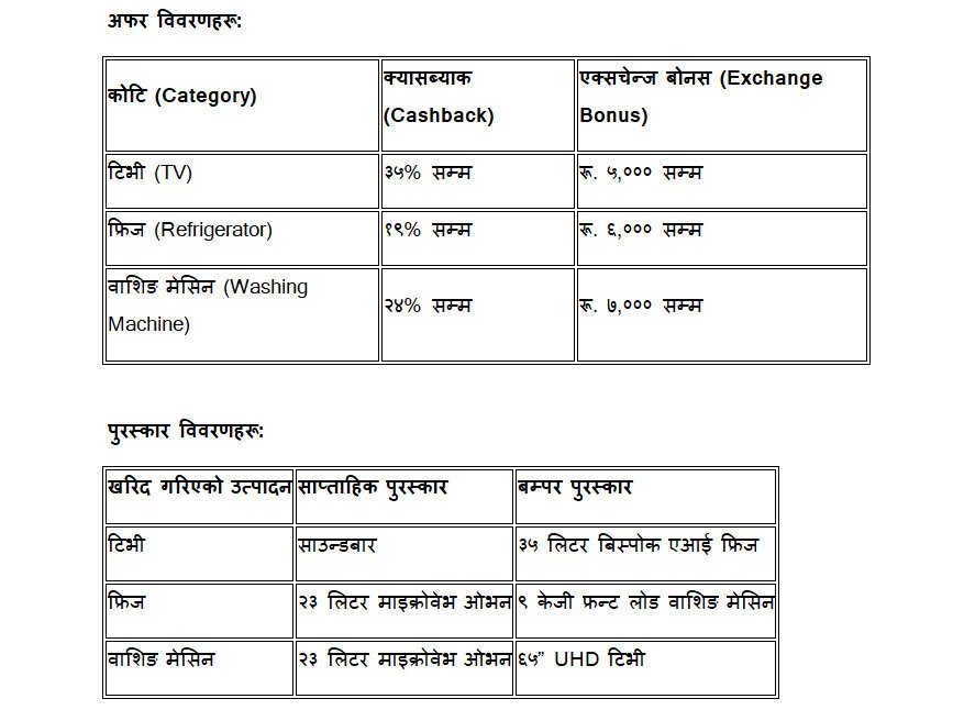 काठमाडौँ । सामसङ नेपालले तिहारलाई लक्षित गरी आफ्नो बहुप्रतिक्षित क्याम्पेन ‘तिहारको मूड, सबै गुड!’ घोषणा गरेको छ। यो अफरमार्फत ग्राहकहरूले सामसङका उत्पादनहरूमा आकर्षक छुटका साथै साप्ताहिक र बम्पर पुरस्कारहरू जित्ने रोमाञ्चक अवसर प्राप्त गर्नेछन्। यो अफर असोज २६ देखि कार्तिक ३०, २०८२ सम्म देशभरका आधिकारिक सामसङ विक्रेताहरूमा लागू हुनेछ। यस अवधिमा ग्राहकहरूले सामसङका टिभी, फ्रिज र वाशिङ मेसिन मा आकर्षक क्यासब्याक र छुटसहित नयाँ उत्पादनहरू खरिद गर्न सक्नेछन्। सामसङका टिभी, फ्रिज वा वाशिङ मेसिन खरिद गर्ने ग्राहकहरूले उत्पादनको सिरियल नम्बर SMS मार्फत पठाएर लक्की ड्रमा भाग लिन सक्नेछन्।
