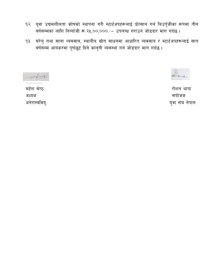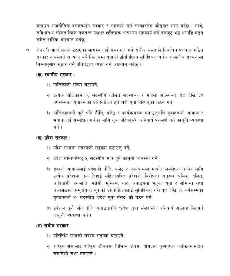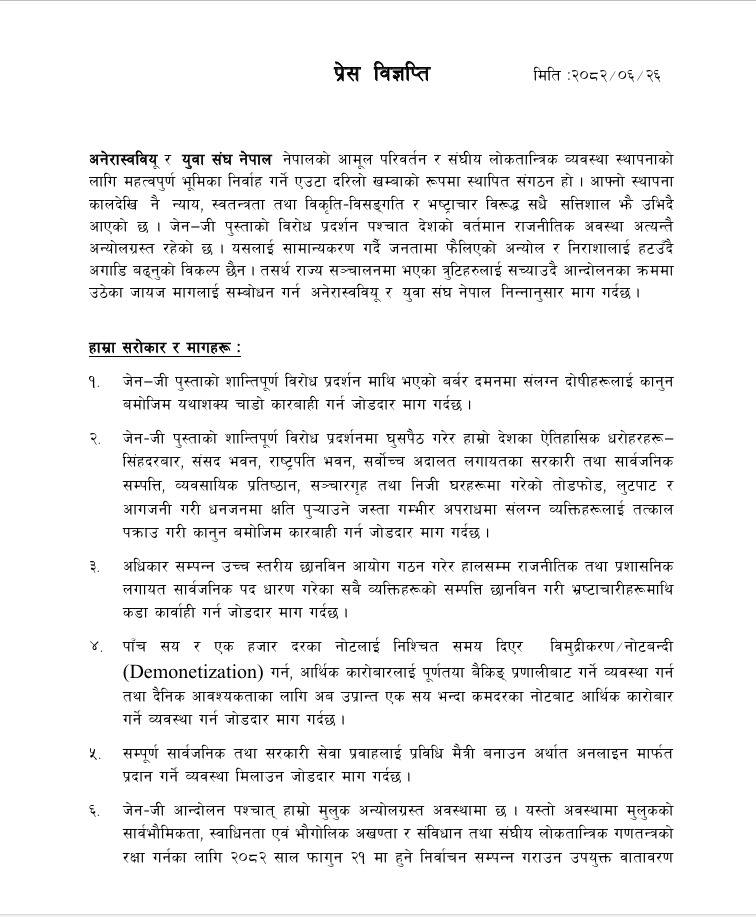जेनजीको विरोध प्रदर्शनपछि देशको वर्तमान राजनीतिक अवस्था अत्यन्तै अन्योलग्रस्त रहेकाले सामान्यकरण गर्दै जनतामा फैलिएको अन्योललाई हटाउनुपर्ने उनीहरूको तर्क छ । अनेरास्ववियूका अध्यक्ष महेश श्रेष्ठ र युवा संघका संयोजक रोशन थापाले जारी गरेको विज्ञप्तिमा १३ बुँदे माग राखिएको छ ।