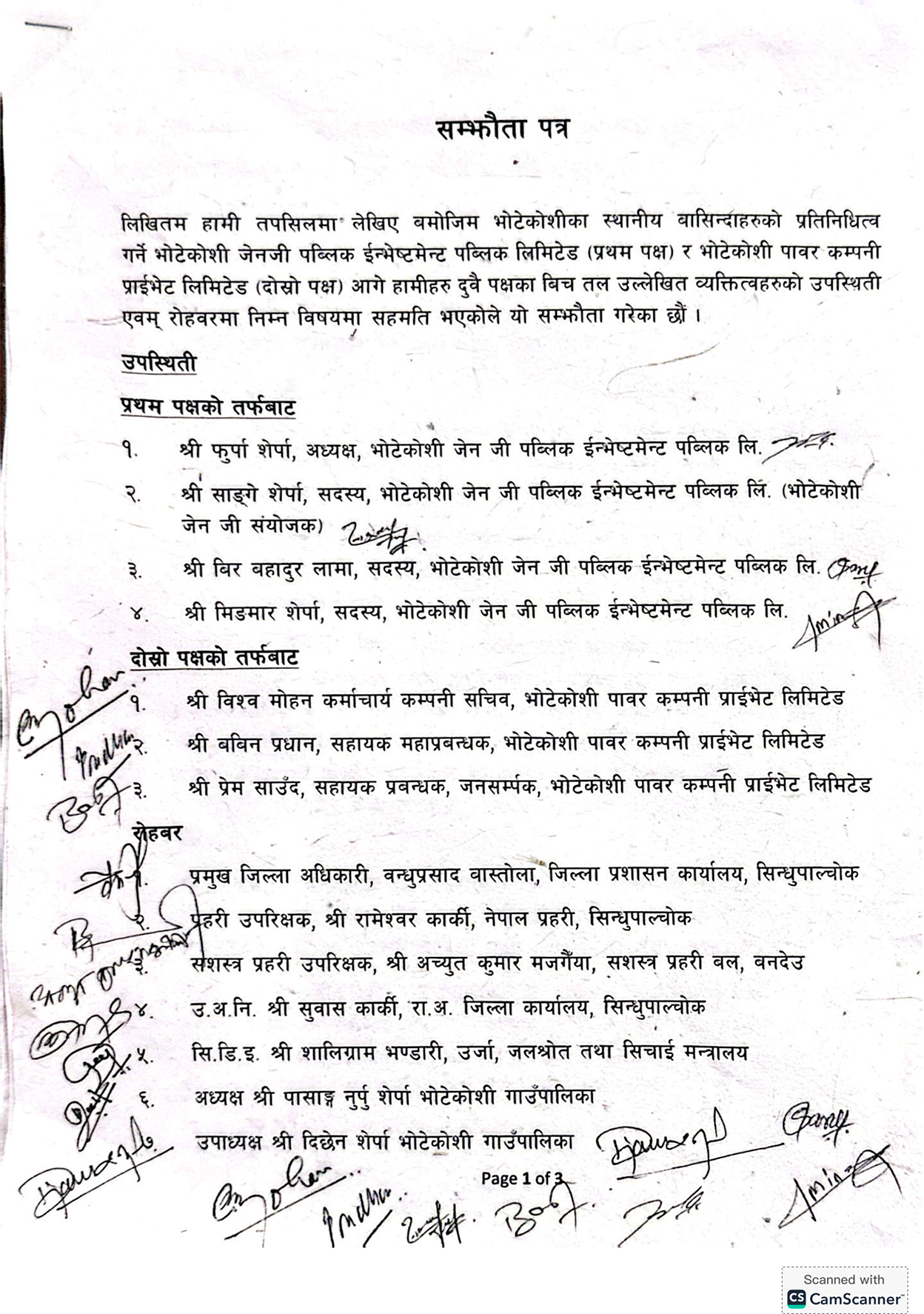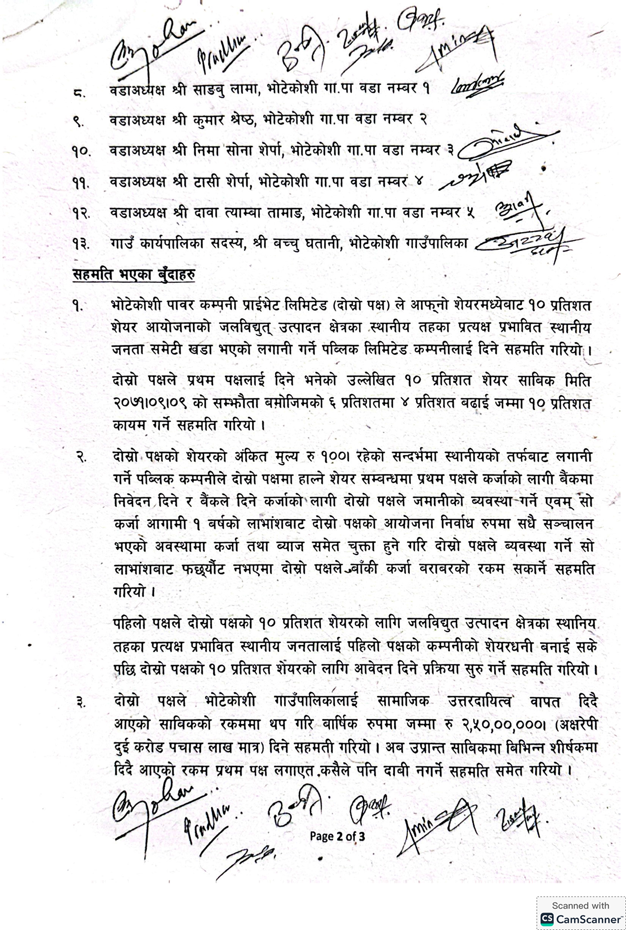 तर भदौ २३–२४ गतेको जेनजी आन्दोलनको क्रममा ‘भोटेकोशी जेनजी ग्रुप’को नाममा स्थानीयको एक समूहले आयोजना बन्द गराउँदै १० प्रतिशत शेयर निस्शुल्क मागेको थियो । कम्पनीले १० प्रतिशत शेयर दिन तयार भएको तर निःशुल्क भने दिन नसकिने बताएको थियो । त्यसैले एक महिनासम्म आयोजना बन्द थियो । तर आइतबार ‘भोटेकोशी जेनजी ग्रुप’ र भोटेकोशी पावर कम्पनीबीच १० प्रतिशत निस्शुल्क सेयर लेनदेन सम्झौता भएको छ । ‘भोटेकोशी पावर कम्पनी प्राइभेट लिमिटेड (दोस्रो पक्ष) ले आफ्नो शेयरमध्येबाट १० प्रतिशत शेयर आयोजनाको जलविद्युत् उत्पादन क्षेत्रका स्थानीय तहका प्रत्यक्ष प्रभावित स्थानीय जनता समेटी खडा भएको लगानी गर्ने पब्लिक लिमिटेड कम्पनीलाई दिने सहमति गरियो,’ सम्झौता पत्रमा भनिएको छ, ‘दोस्रो पक्षले प्रथम पक्षलाई दिने भनेको उल्लेखित १० प्रतिशत शेयर साबिक २०७१।०९।०९ को सम्झौता बमोजिमको ६ प्रतिशतमा ४ प्रतिशत बढाई जम्मा १० प्रतिशत कायम गर्ने सहमति गरियो ।