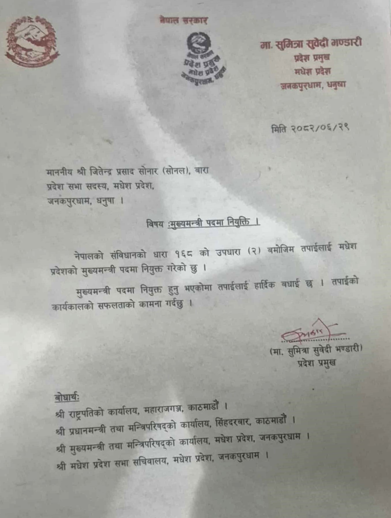 काठमाण्डौं । मधेस प्रदेशको मुख्यमन्त्री लोकतान्त्रिक समाजवादी पार्टीका नेता जितेन्द्र प्रसाद सोनार (सोनल) नियुक्त भएका छन्। प्रदेश प्रमुख सुमित्रा सुवेदी भण्डारीले सोनललाई मुख्यमन्त्री पदमा नियुक्त गरेकी हुन्। प्रदेश प्रमुखको कार्यालयका निमित्त सचिव शत्रुधन यादवले प्रेस विज्ञप्ति जारी गर्दै जनता समाजवादी पार्टी नेपाल, जनमत पार्टी, नेकपा माओवादी केन्द्र, लोकतान्त्रिक समाजवादी पार्टी नेपाल, नेकपा एकीकृत समाजवादी सहित पाँच राजनीतिक दलका ५६ जना प्रदेश सभा सदस्यहरूको समर्थनमा प्रदेश सभा सदस्य जितेन्द्र प्रसाद सोनार (सोनल) लाई नेपालको संविधानको धारा १६८ को उपधारा २ बमोजिम मुख्यमन्त्री पदमा नियुक्त गरेको जानकारी गराएका छन्। उक्त धारामा प्रदेश सभामा कुनै पनि दलको स्पष्ट बहुमत नरहेको अवस्थामा प्रदेश सभामा प्रतिनिधित्व गर्ने दुई वा दुईभन्दा बढी दलहरूको समर्थनमा बहुमत प्राप्त गर्न सक्ने प्रदेश सभाका सदस्यलाई प्रदेश प्रमुखले मुख्यमन्त्री नियुक्त गर्न सक्ने प्रावधान छ। सोनल मधेस आन्दोलन समयमा अग्रपंक्तिमा रहेर काम गरेका नेता हुन्। ०७९ को निर्वाचनमा उनी बारा क्षेत्र नम्बर ४ ९ख० बाट प्रदेश सभा सदस्यमा निर्वाचित भएका थिए। सोनलले १२ हजार १८१ मत प्राप्त गरेका थिए।