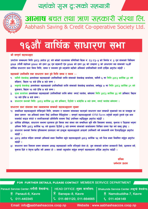 आर्थिक सहकारी आभाष बचत तथा ऋण सहकारी संस्थाको १६औं वार्षिक साधारण सभासम्बन्धी सूचना सत्याग्रहअनलाइन/काठमाडौं न्युज - संवाददाता २०८२ कार्तिक १७, सोमबार सेयर गर्नुहोस्