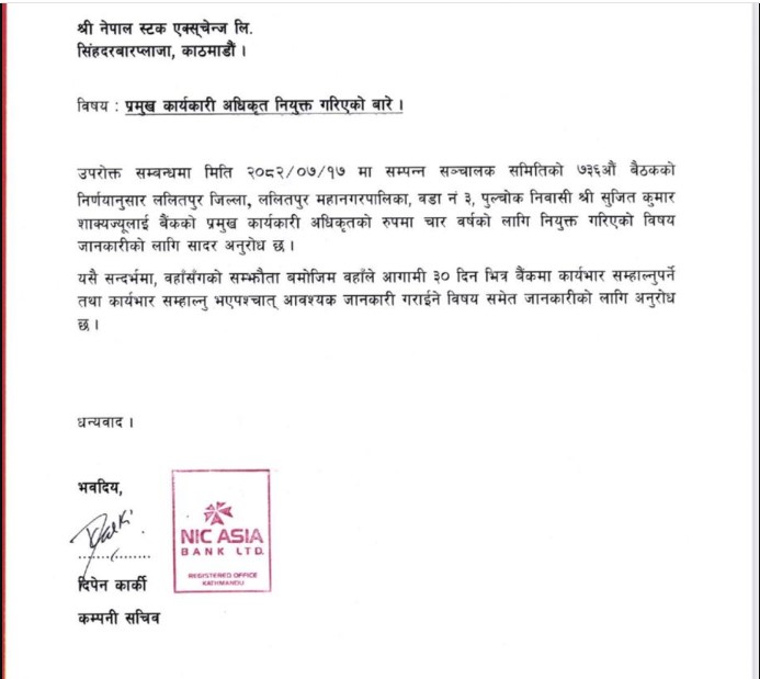 काठमाडौँ । एनआईसी एशिया बैंकले प्रमुख कार्यकारी अधिकृत (सीईओ) मा सुजित कुमार शाक्यलाई नियुक्त गरेको छ । कम्पनीको कात्तिक १७ गते बसेको संञ्चालक समितिको बैठकले शाक्यलाई सीईओको जिम्मेवारी दिने निर्णय गरेको हो । शाक्य बैंकको सीईओको रुपमा चार वर्षको लागि नियुक्त गरिएको हो । उनले अबको ३० दिन भित्र बैंकमा कार्यभार सम्हाल्नेछन् ।