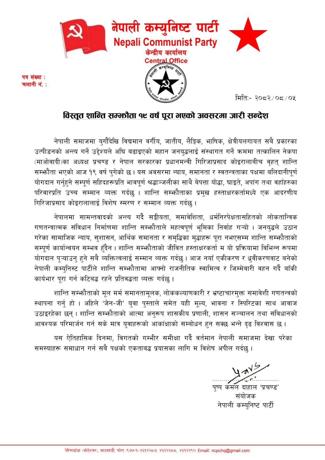 विस्तृत शान्ति सम्झौता १९ वर्ष पूरा भएको अवसरमा प्रचण्डको सन्देश