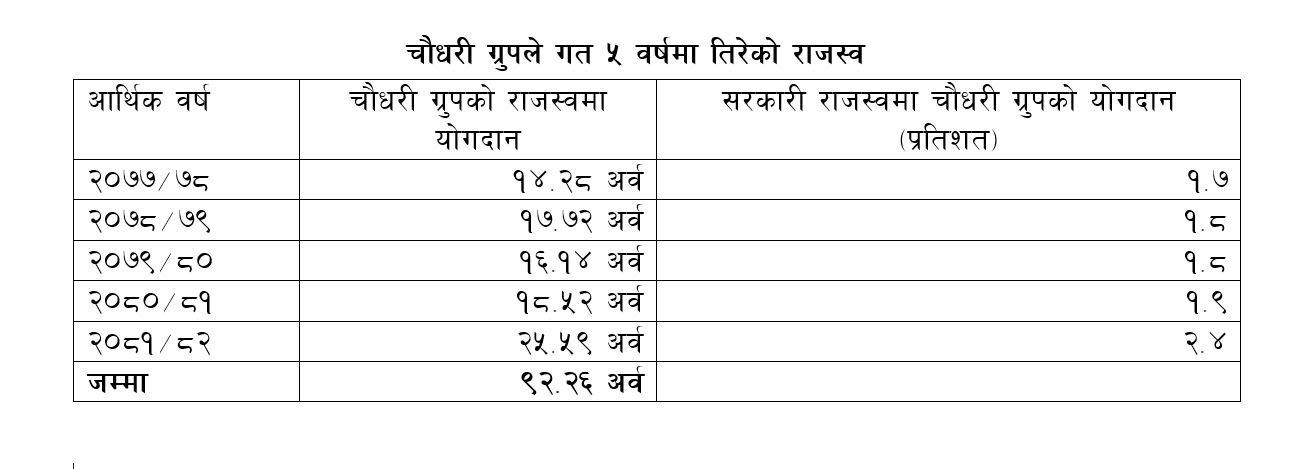 यो सँगै विगत पाँच वर्षमा चौधरी ग्रुपले सरकारलाई ९२ अर्ब २६ करोड रुपैयाँ कर तिरेको छ । कमजोर आर्थिक गतिविधि, आयात–निर्भर बजार, नीतिगत अस्थिरता तथा निजी लगानीमा आएका बाधाका बाबजुद पनि चौधरी ग्रुपले निरन्तर करमा वृद्धि गर्दै आएको छ । यसले राष्ट्रका विकास योजनाहरू, सामाजिक सुरक्षा, पूर्वाधार निर्माण तथा सार्वजनिक सेवाका क्षेत्रमा राज्यलाई थप आधार प्रदान गर्ने चौधरी ग्रुपले विश्वास लिएको छ । चौधरी ग्रुपका प्रबन्ध निर्देशक निर्वाण चौधरीका अनुसार, चौधरी ग्रुपले स्थापित तथा नयाँ दुवै व्यवसाय विस्तारमार्फत राजश्व योगदान बढाउँदै लगिरहेको छ। नेपालमा व्यवसायिक समूहहरूले सरकारलाई तिरेको कर अलग्गै वर्गीकृत गरी सार्वजनिक गर्ने परम्परा अझै स्थापित नभएकाले कतिपय समयमा करदाताको वास्तविक योगदानबारे जनमानसमा भ्रम उत्पन्न हुनेगर्छ। यस्तो अवस्थालाई अन्त्य गर्दै चौधरी ग्रुपले हरेक वर्ष आफ्नो एकमुष्ट कर विवरण पारदर्शी रूपमा सार्वजनिक गर्दै आएको छ । यसले राष्ट्र निर्माणमा व्यवसायिक क्षेत्रको भूमिकालाई स्पष्ट पार्नुका साथै, सरकारलाई पनि समूहगत कर योगदान छुट्टै गणना गरी पारदर्शी रूपमा खुलाउने संयन्त्र विकास गर्न प्रेरित गर्ने विश्वास लिइएको छ ।