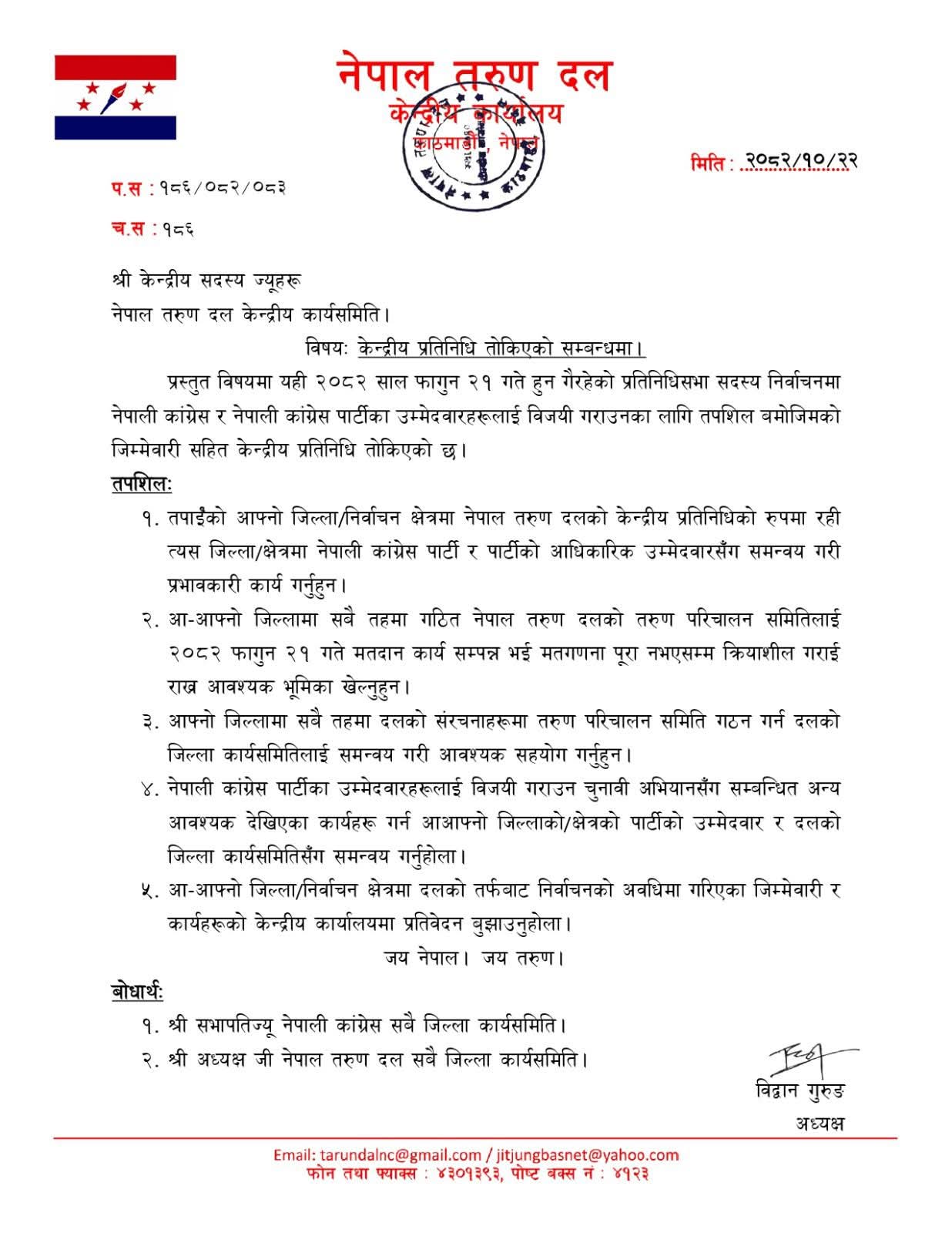 आ–आफ्नो जिल्लामा सबै तहमा गठित नेपाल तरुण दलको तरुण परिचालन समितिलाई फागुन २१ गते मतदान कार्य सम्पन्न भई मतगणना पूरा नभएसम्म क्रियाशील गराई राख्न आवश्यक भूमिका खेल्न आग्रह गरिएको तरुण दलका अध्यक्ष विद्वान गुरुङले जानकारी दिए । जिल्लामा सबै तहमा दलको संरचनाहरूमा तरुण परिचालन समिति गठन गर्न दलको जिल्ला कार्यसमितिलाई समन्वय गरी आवश्यक सहयोग परिपत्र गरिएको छ । नेपाली कांग्रेस पार्टीका उम्मेदवारहरूलाई विजयी गराउन चुनावी अभियानसँग सम्बन्धित अन्य आवश्यक देखिएका कार्यहरू गर्न आआफ्नो जिल्लाको,क्षेत्रको पार्टीको उम्मेदवार र दलको जिल्ला कार्यसमितिसँग समन्वय गर्न समेत भनिएको छ । त्यस्तै आ–आफ्नो जिल्लारनिर्वाचन क्षेत्रमा दलको तर्फबाट निर्वाचनको अवधिमा गरिएका जिम्मेवारी र कार्यहरूको केन्द्रीय कार्यालयमा प्रतिवेदन बुझाउन भनिएको छ ।