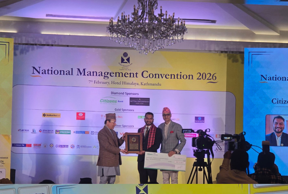 काठमाडौं । सिटिजन्स बैंक इन्टरनेसनल लिमिटेडले म्यान सिटिजन एसपाइरिङ मेनेजर अवार्ड–२०८२ गौरव उप्रेतीलाई प्रदान गरेको छ । उक्त अवार्ड नेपाल व्यवस्थापन संघ (एमएएन( द्वारा आयोजना गरिएको राष्ट्रिय व्यवस्थापन सम्मेलनमा माघ २४ गते प्रदान गरिएको हो । प्रधान न्यायाधीश प्रकाशमान सिंह राउतले कार्यक्रमकाबीच पुरस्कार प्रदान गरेका थिए । पुरस्कार छनोट प्रक्रिया सिटिजन्स बैंक, पूर्वाञ्चल विश्वविद्यालय तथा नेपाल व्यवस्थापन संघका पदाधिकारीहरूको संयुक्त समितिले गरेको हो। यस अवार्डले नेपालको व्यवस्थापन शिक्षा क्षेत्रमा महत्वपूर्ण योगदान पु¥याउने र भविष्यका व्यवस्थापन पेशेवरहरूलाई प्रोत्साहित गर्ने विश्वास बैंकले लिएको छ । सिटिजन्स बैंक इन्टरनेसनल लिमिटेड र नेपाल व्यवस्थापन संघबीच गत वर्ष एमबीए तहमा उत्कृष्ट प्रदर्शन गर्ने विद्यार्थीलाई सम्मान गर्ने उद्देश्यले सम्झौता भएको थियो । सो सम्झौताअनुसार प्रत्येक वर्ष पूर्वाञ्चल विश्वविद्यालय अन्तर्गत एमबीएमा उत्कृष्ट नतिजा ल्याउने विद्यार्थीलाई ५१ हजार रुपैयाँ नगद पुरस्कार प्रदान गरिनेछ।
