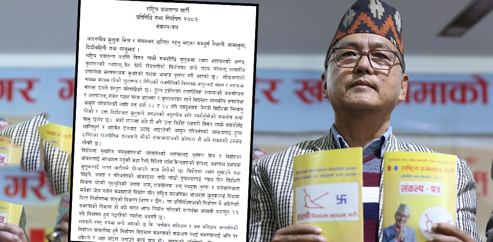काठमाडौँ । राष्ट्रिय प्रजातन्त्र पार्टी (राप्रपा) ले फागुन २१ गते हुने प्रतिनिधि सभा निर्वाचनका लागि आफ्नो मुख्य प्रतिबद्धता समेटिएको संकल्प पत्र सार्वजनिक गरेको छ। सबल, समृद्ध र समुन्नत नेपाल – पृथ्वी पथुको मूल नाराका साथ पार्टी अध्यक्ष राजेन्द्र लिङ्देनले शनिबार राजधानीमा आयोजित कार्यक्रमका बिच संकल्प पत्र सार्वजनिक गरेका हुन् । राप्रपाले अहिलेको प्रदेश तहलाई पूर्ण रूपमा खारेज गर्दै केन्द्र र बलियो स्थानीय तहसहितको दुई तहको शासकीय संरचनाको प्रस्ताव अघि सारेको छ। विशेष गरी स्थानीय तहलाई राजनीतिक हस्तक्षेपमुक्त बनाउन गैरदलीय आधारमा निर्वाचन गर्ने एजेन्डालाई पार्टीले प्राथमिकताका साथ उठाएको छ। पार्टीको राजनीतिक दर्शनका रूपमा संवर्धनवाद लाई अघि सार्दै राप्रपाले अभिभावकीय संस्थाको रूपमा राजसंस्था र सर्वधर्म समभावसहितको वैदिक सनातन धर्मसापेक्ष हिन्दु राष्ट्रको पुनर्स्थापनालाई आफ्नो मुख्य लक्ष्य बनाएको छ। संकल्प पत्रमा वर्तमान खर्चिलो र अस्थिर निर्वाचन प्रणालीमा सुधार गरी प्रत्यक्ष निर्वाचित प्रधानमन्त्री र पूर्ण समानुपातिक संसद्को अवधारणालाई समेटिएको छ। भ्रष्टाचार विरुद्ध शून्य सहनशीलताको नीति लिँदै राप्रपाले २०४६ सालपछिका सबै उच्चपदस्थ नेता तथा कर्मचारीहरूको सम्पत्ति छानबिन गरी अवैध रूपमा आर्जित सम्पत्ति जफत गर्ने कडा कानुनी व्यवस्था मिलाउने प्रतिबद्धता व्यक्त गरेको छ। आर्थिक समृद्धिका लागि राप्रपाले जलस्रोत र ऊर्जा क्षेत्रलाई मुख्य आधार स्तम्भ मानेको छ। आगामी १० वर्षलाई ुऊर्जा उत्पादन दशकु घोषणा गर्दै २८ हजार ५ सय मेगावाट विद्युत उत्पादन गर्ने र नेपाललाई शतप्रतिशत हरित ऊर्जा प्रयोग गर्ने निर्यातकर्ता मुलुकको रूपमा स्थापित गर्ने लक्ष्य लिइएको छ। साथै, कृषिमा आधुनिकीकरण, रासायनिक मल कारखानाको स्थापना, र प्रत्येक स्थानीय तहमा नेपाल मार्ट जस्ता परियोजना सञ्चालन गरी स्वदेशी उत्पादनलाई प्रोत्साहन गर्ने योजना सार्वजनिक गरिएको छ। सूचना प्रविधि क्षेत्रलाई राष्ट्रिय प्राथमिकताको उद्योगका रूपमा विकास गर्दै लाखौँ रोजगारी सिर्जना गर्ने र डिजिटल नेपालको अवधारणालाई पूर्ण कार्यान्वयन गर्ने पार्टीको संकल्प छ। शिक्षा र स्वास्थ्य क्षेत्रमा नागरिकको मौलिक हक सुनिश्चित गर्न राप्रपाले कक्षा १२ सम्मको शिक्षा पूर्ण रूपमा निःशुल्क गर्ने र आधारभूत स्वास्थ्य उपचार सेवा सबै नागरिकलाई सरकारी अस्पतालमा निःशुल्क उपलब्ध गराउने घोषणा गरेको छ।