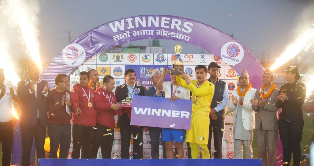 मच्छिन्द्र क्लबले झापा गोल्डकपको उपाधि जितेको छ । सशस्त्र प्रहरीको एपीएफ फुटबल क्लबलाई ३–१ गोल अन्तरले पराजित गर्दै मछिन्द्रले एक्स्ट्रिम सातौँ झापा गोल्डकप विनोद बस्नेत स्मृति संस्करणको उपाधि जितेको हो । अधिकांश झापाली खेलाडी सहभागी मच्छिन्द्रले पहिलोपटक झापा गोल्डकपको उपाधि उचालेको हो । खेलको ३१औँ मिनेटमा मछिन्द्रले अग्रता बनायो । मच्छिन्द्रले अर्को गोल पहिलो हाफको अन्तिम समयमा गर्यो । पहिलो हाफमा २ गोल गरेको मच्छिन्द्रले ८३औँ मिनेटमा अर्को गोल थप्यो । ७६औँ मिनेटमा डिफेन्डर मानबहादुर राना मगर दोहोरो पहेँलो कार्डका कारण रातो कार्ड पाउँदै मैदानबाट बाहिरिएपछि एपीएफ १० खेलाडीमा सीमित हुँदा थप दबाबमा पर्यो । ८२औँ मिनेटमा एपीएफले एक गोल फर्काए पनि पराजय टार्न सकेन । उपाधिसँगै मच्छिन्द्रले नगद १५ लाख र ट्रफी प्राप्त गरेको छ । एपीएफले भने ७ लाख ५० हजार रुपैयाँमा चित्त बुझायो । प्लेयर अफ द म्याच मच्छिन्द्रका प्रदीप बुढाथोकी घोषित भए । उनले नगद २५ हजार पाए । प्रतियोगिताको सर्वोत्कृष्ट खेलाडी मच्छिन्द्रका पेमा तामाङ भए । उनले यामाहाको मोटरसाइकल पाए । बेष्ट गोलकिपर घोषित मच्छिन्द्रका विशाल श्रेष्ठ, बेष्ट कोच मच्छिन्द्रकै प्रवेश कटवाल, हाई स्कोरर मच्छिन्द्रका जोनाथन जोरिल्ला भए । उनीहरूले जनही ३५ हजार रुपैयाँ र ट्रफी पाए । प्रतियोगितामा टिकट लिएर फुटबल हेर्ने दर्शकमध्ये गोलाप्रथाबाट बिर्तामोडकी प्रिती मोक्तानले यामाहाको स्कुटर जितिन् । यसैबीच, नेपाली राष्ट्रिय फुटबल टिमका पूर्वसदस्य नरोत्तम गौतमलाई नगद २५ हजार रुपैयाँसहित सम्मान गरिएको थियो । प्रतियोगितामा नेपाल पुलिस, एपीएफ, त्रिभुवन आर्मी फुटबल क्लब, मछिन्द्र फुटबल क्लब, लालिगुराँस एसोसिएसन नेपाल पोखरा, चर्च ब्वाइज युनाइटेड, आयोजक झापा–११ तथा भारतको सिङलिङ स्पोर्टिङ क्लब, भुटानको आरटीसी भुटान र मलेसियाको एन पेनाङ एफसीको सहभागिता थियो ।