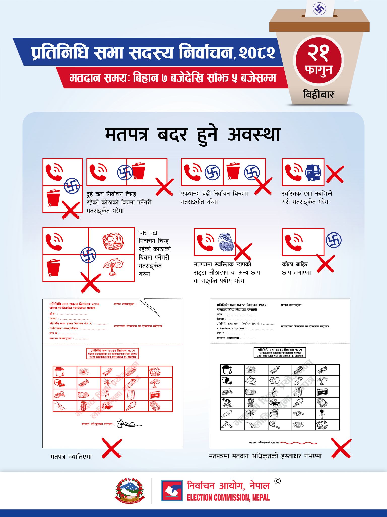 काठमाडौं । प्रतिनिधिसभा सदस्य निर्वाचनअन्तर्गत आज मतदान हुँदे छ । बिहान ७ देखि बेलुका ५ बजेसम्म मतदानको समय तोकिएको छ । निर्वाचन आयोगले तोकेअनुसार मतदान नगरे मतपत्र बदर हुनसक्छ । दुई चिर्वाचन चिह्न रहेको कोठाको बीचमा पर्ने गरी मतसंकेत गरेमा मतपत्र बदर हुन्छ । यस्तै, एकभन्दा बढी निर्वाचन चिह्नमा मतसंकेत गरेमा मत बदर हुन्छ ।