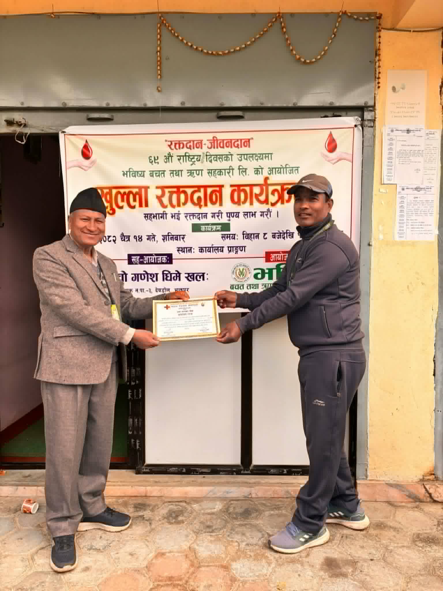 भक्तपुर । भबिष्य बचत तथा ऋण सहकारी संस्थाको ६९ औं राष्ट्रिय सहकारी दिवसको अवसर र तुवाचो गणेश धिमाय खलःको सह आयोजना तथा भक्तपुर रेडक्रसको प्राबिधिक सहयोगार्थ गरीएको बार्षिकी कार्य योजना अनुसार पाचौं पटकको रक्तदान कार्यक्रम सम्पन्न भएको छ । रक्तदान कार्यक्रममा ३२ जनाको सहभागिता रहेको थियो ।