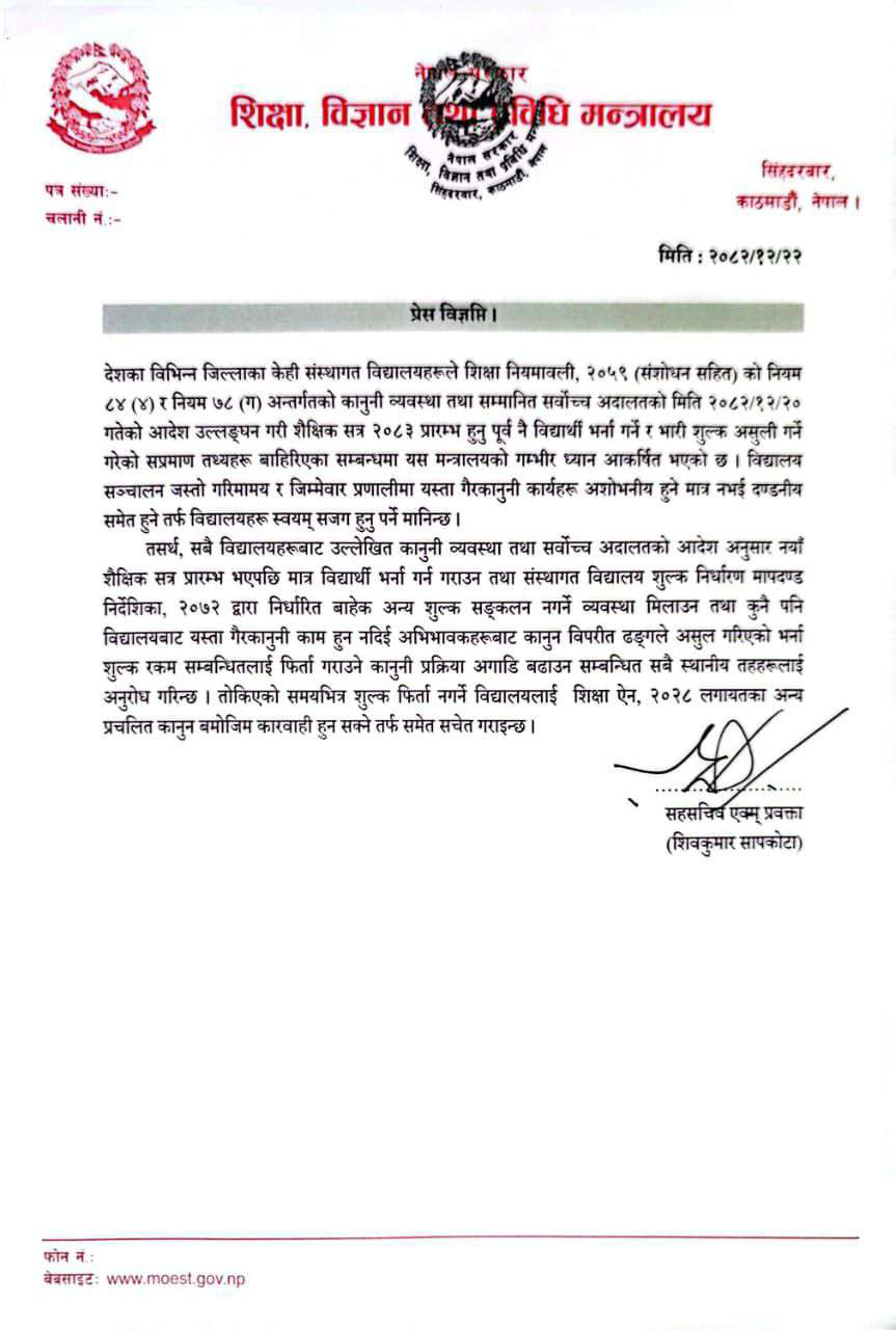 मन्त्रालयले सबै स्थानीय तहहरूलाई आआफ्नो क्षेत्रभित्रका विद्यालयहरूबाट कानुनविपरीत असुल गरिएको भर्ना शुल्क सम्बन्धित अभिभावकलाई फिर्ता गराउने प्रक्रिया अगाडि बढाउन अनुरोध गरेको छ । नयाँ शैक्षिक सत्र प्रारम्भ भएपछि मात्र भर्ना प्रक्रिया सुरु गर्न र संस्थागत विद्यालय शुल्क निर्धारण मापदण्ड निर्देशिका, २०७२ ले तोकेभन्दा बढी शुल्क नलिन मन्त्रालयले निर्देशन दिएको छ । तोकिएको समयभित्र अवैध रूपमा लिइएको शुल्क फिर्ता नगर्ने विद्यालयहरूलाई शिक्षा ऐन, २०२८ र अन्य प्रचलित कानुन बमोजिम कारबाही गरिने मन्त्रालयले जनाएको छ ।