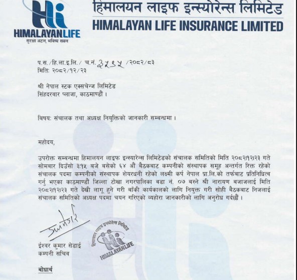 काठमाडौँ । हिमालयन लाइफ इन्स्योरेन्सको अध्यक्षमा नारायण बजाज नियुक्त भएका छन् । कम्पनीको चैत २३ गते बसेको संचालक समितिको बैठकले बजाजलाई अध्यक्षको जिम्मेवारी दिने निर्णय गरेको हो । कम्पनीको संस्थापक समूह अन्तर्गत रिक्त रहेको संचालक पदमा कम्पनीको संस्थापक शेयरधनी रहेको लक्ष्मी कर्प नेपाल प्रालिको तर्फबाट प्रतिनिधि गर्ने बजाजलाई आजकै मितिदेखि लागू हुनेगरी कम्पनीको अध्यक्षमा चयन गरिएको हो । यसअघि कम्पनीका अध्यक्ष रहेका शुलभ अग्रवालले राजिनामा दिएका थिए ।