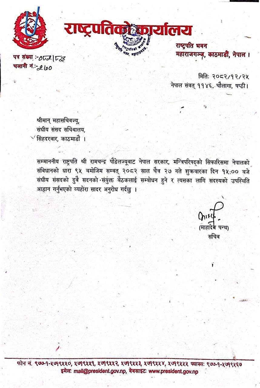 काठमाडौं । राष्ट्रपति रामचन्द्र पौडेलले शुक्रबार (चैत २७) दुवै सदन (प्रतिनिधिसभा र राष्ट्रियसभा)लाई सम्बोधन गर्ने भएका छन् । राष्ट्रपति कार्यालय अनुसार, शुक्रबार दिउँसो ३ बजे सम्बोधन गर्ने गरी संसद् सचिवालयलाई पत्र पठाइएको छ । राष्ट्रपतिले गत फागुन २१ मा सम्पन्न निर्वाचनपछि संसद्को अधिवेशनलाई सम्बोधन लागेका हुन् । र, यस्तो व्यवस्था संविधानमा छ ।
