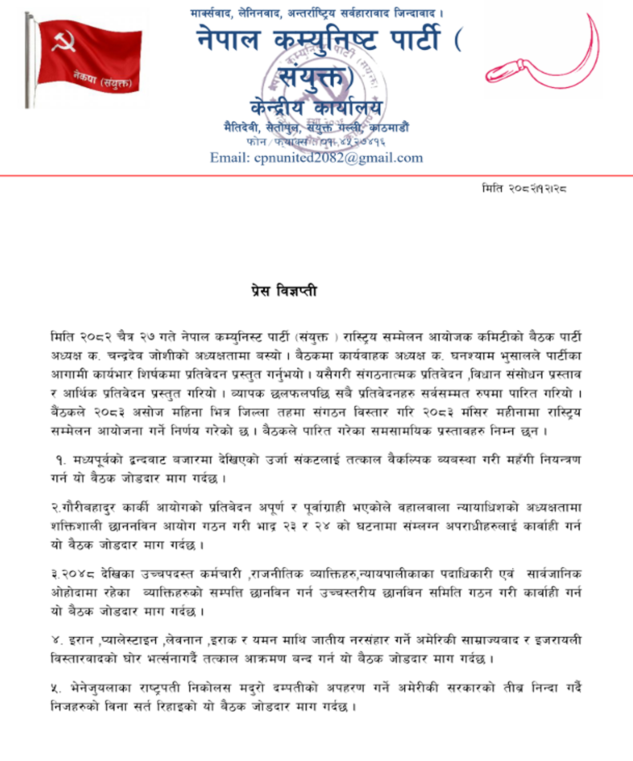 काठमाडौं । नेकपा संयुक्तले पूर्व न्यायाधीश गौरीबहादुर कार्की नेतृत्वको जाँचबुझ आयोगको प्रतिवेदनलाई अपूर्ण र पूर्वाग्रही भनेर टिप्पणी गरेको छ । शनिबार बसेको नेकपा संयुक्तको महाधिवेशन आयोजक समिति बैठकले कार्की आयोगको प्रतिवेदनलाई अपूर्ण र पूर्वाग्रही भन्दै अर्को आयोग गठन गरेर भदौ २३ र २४ गतेका घटनाको जाँचबुझ गर्न माग गरेको हो । सो पार्टीका कार्यवाहक अध्यक्ष घनश्याम भुसालद्वारा जारी विज्ञप्तिमा विभिन्न राष्ट्रिय तथा अन्तर्राष्ट्रिय विषयसहित ११ बुँदे निर्णय भएको उल्लेख छ ।